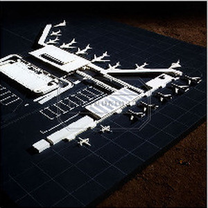 Fotografía de una maqueta “vista desde el sur oriente”, que representa una vista de conjunto del Aeropuerto Pudahuel.