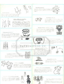 Láminas originales con dibujos esquemáticos de: Fell’s Cave - Ojo de huanacos - La caza - Manos - Danza mágica - Dios pescador - Armas - Pueblos pescadores - El maiz - Pueblos nómades - Riego - Pueblo atacameño - Venus de Tlatilco.