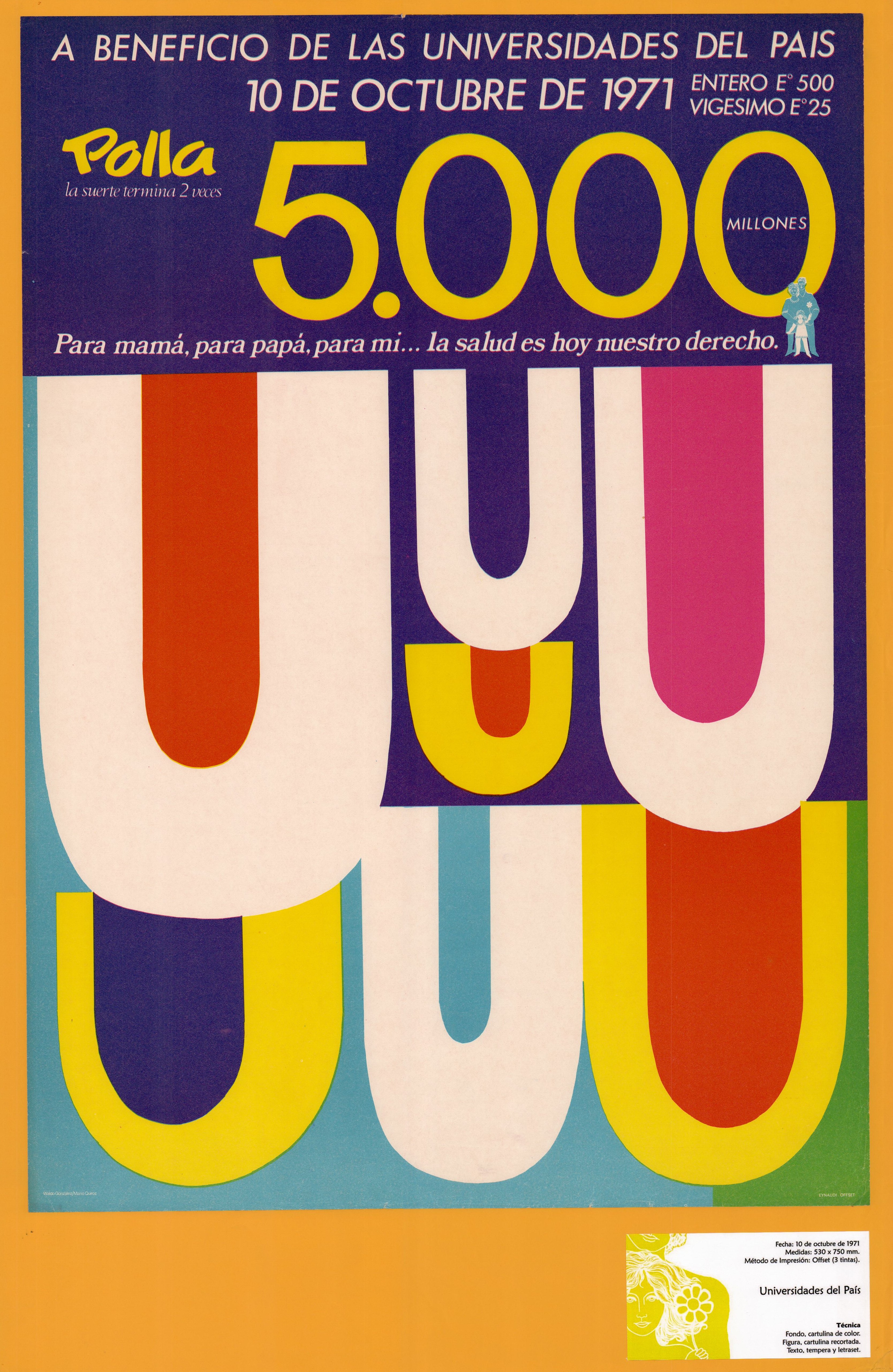 Texto: A beneficio de las universidades del país. 10 de octubre de 1971. Entero E° 500 vigésimo E° 25. Polla, la suerte termina 2 veces. 5.000 millones. Para mamá, para papá, para mi... la salud es hoy nuestro derecho.