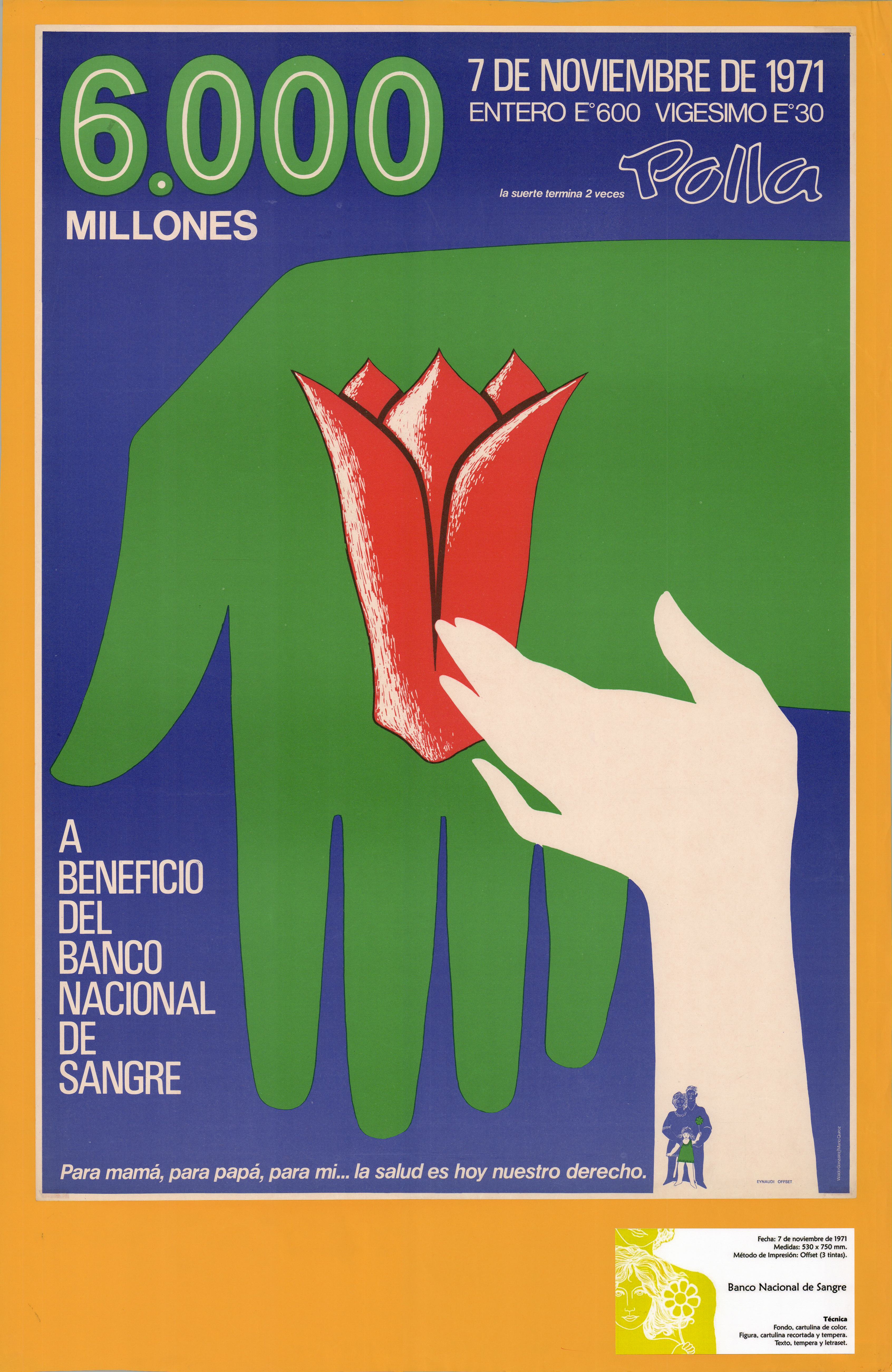Texto: 6.000 millones. 7 de noviembre de 1971. Entero E° 600 vigésimo E° 30. La suerte termina 2 veces Polla. A beneficio del Banco Nacional de Sangre. Para mamá, para papá, para mi... la salud es hoy nuestro derecho.