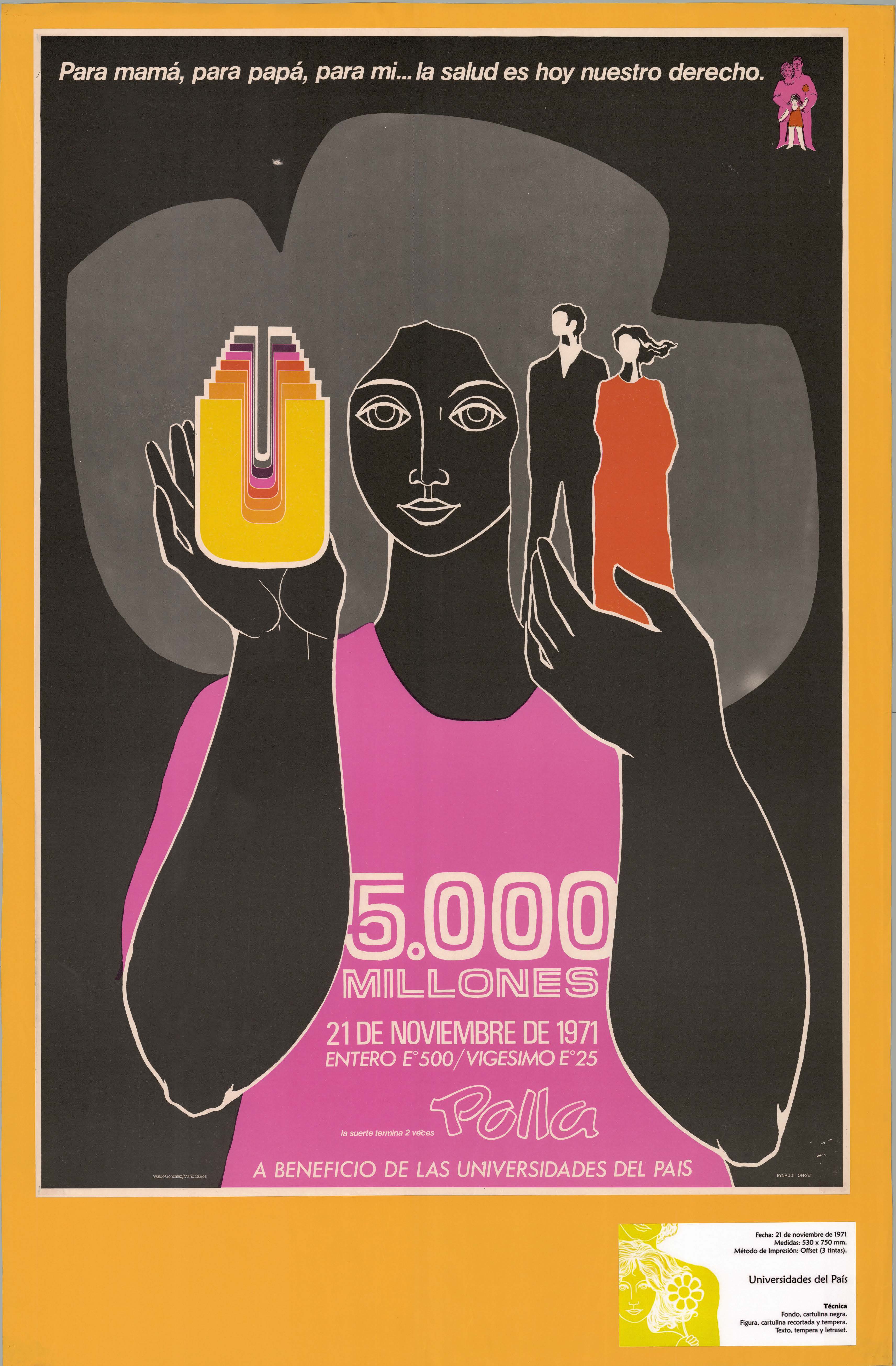 Texto: Para mamá, para papá, para mi... la salud es hoy nuestro derecho. 5.000 millones. 21 de noviembre de 1971. Entero E° 500 / vigésimo E° 25. La suerte termina 2 veces Polla. A beneficio de las universidades del país.