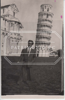 Foto - postal de Juan Borchers en Pisa, junto a la Torre Inclinada. En el reverso, Borchers escribe unas palabras a su familia.