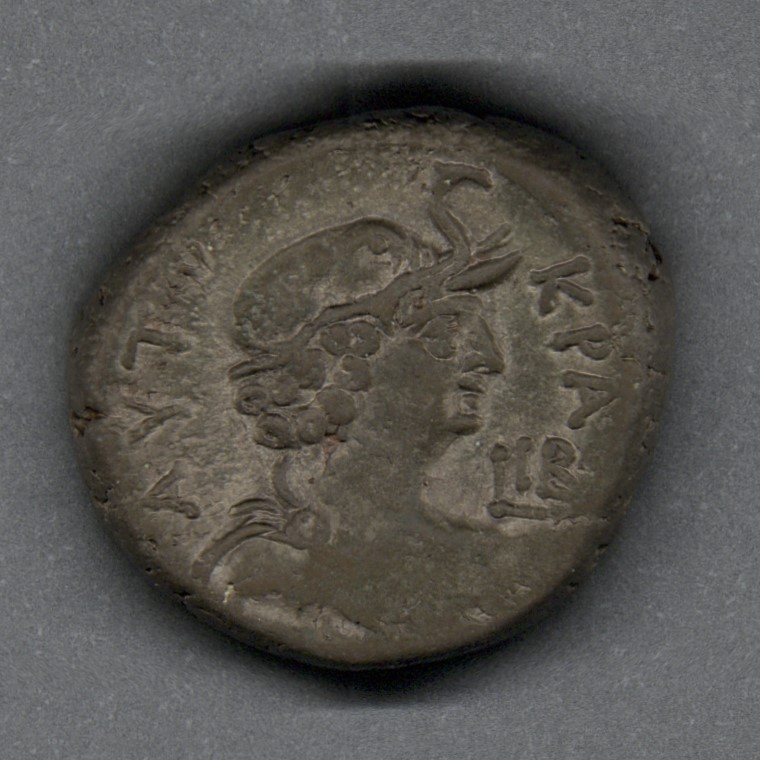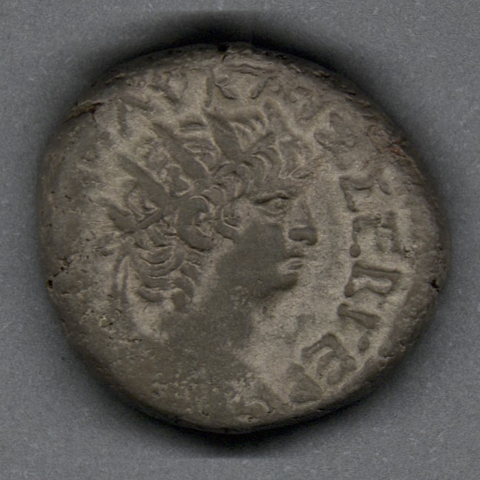 Moneda provincial acuñada por el emperador Nerón en el año 12 de su reinado. Anverso con el busto radiado del emperador Nerón a la derecha, vistiendo la égida, leyenda "ΝΕΡΩ ΚΛΑΥ ΚΑΙΣ ΣΕΒ ΓΕΡ" parcialmente visible. Reverso con el busto de la divinización de Alejandría con tocad de elefante a la derecha, leyenda "ΑΥΤΟ- ΚΡΑ / L ΙΒ". Fabricada por acuñación a martillo, peso de 12,4 gr.