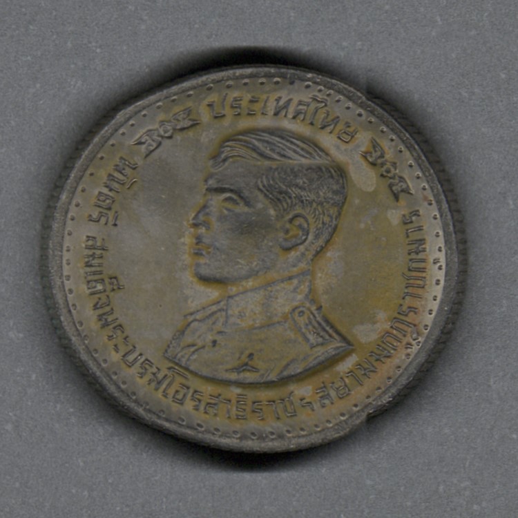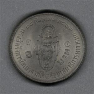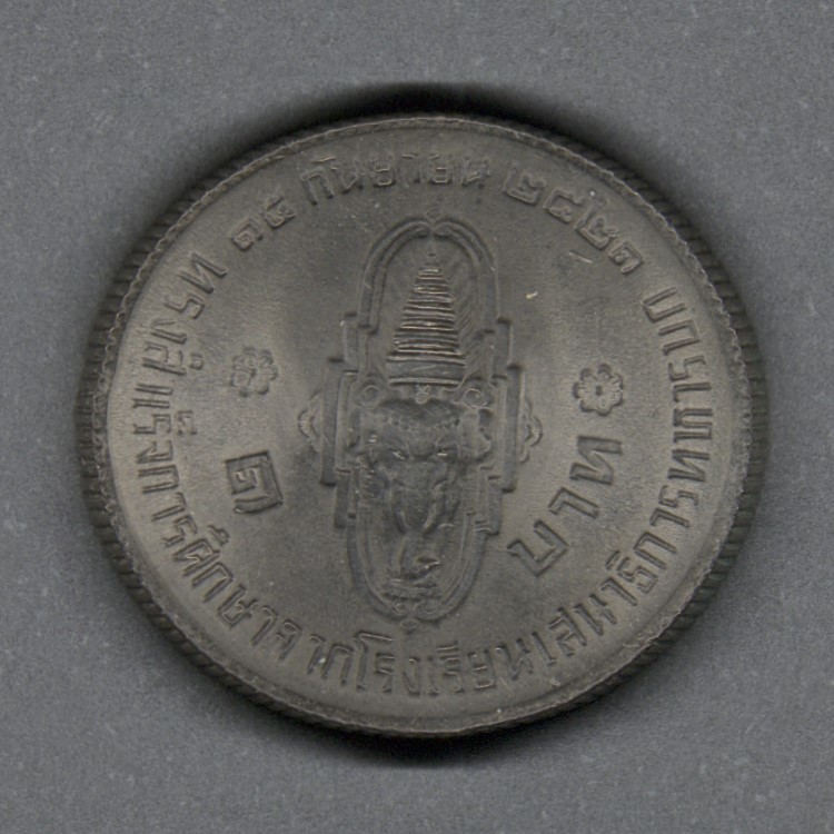 Moneda circulante conmemorativa de Tailandia por la Ceremonia de graduación del Príncipe Vajiralongkorn (15 de septiembre). En anverso presenta perfil a la izquierda del príncipe Vajiralongkorn rodeado por la leyenda "Tailandia. Mayor General Su Alteza Real el Príncipe Heredero Maha Vajiralongkorn". Al reverso, corona ovalada con elefante al centro rodeado por la denominación y la leyenda "Graduado de la Escuela de Comando y Estado Mayor del Ejército". El diseño del canto es juncoso.