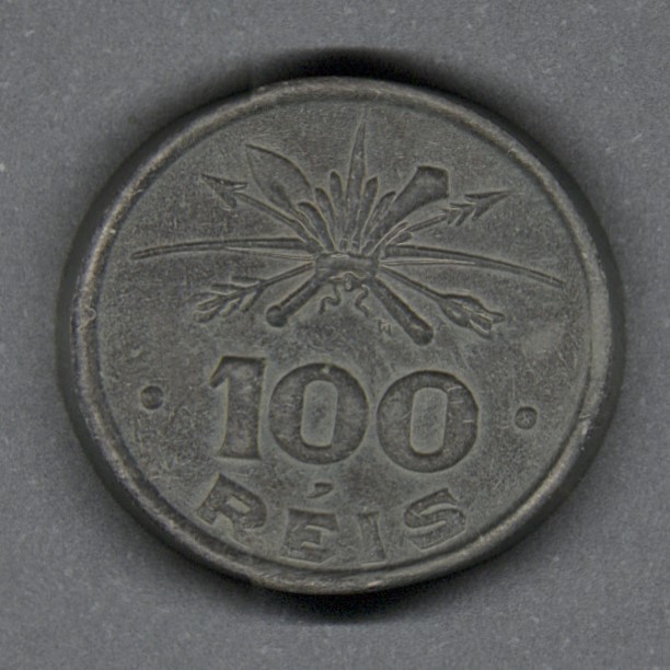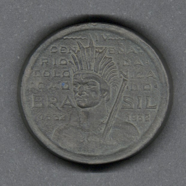 Monedas circulantes conmemorativas de Brasil, 400 aniversario de la colonización. En anverso retrato de Cazique Tibiriçá (fallecido en 1562), líder tupiniquim, aliado de los portugueses. En reverso denominación de la moneda por debajo del diseño.