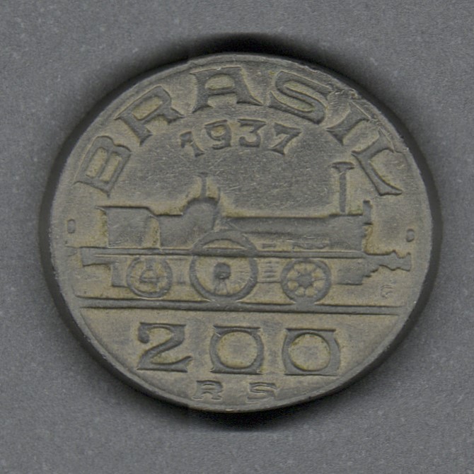Monedas circulantes normales de Brasil. En anverso máquina de vapor, fecha arriba, denominación abajo. En reverso retrato de Irineu Evangelista de Souza, barón y vizconde de Mauá (1813-1889), empresario, industrial, banquero y político brasileño.