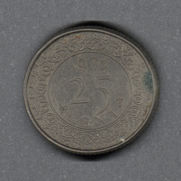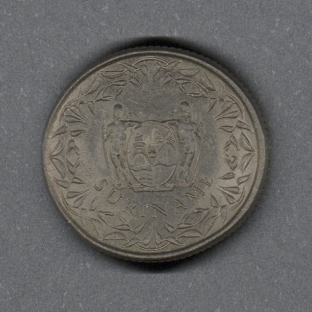 Monedas circulantes normales de Surinam. En anverso escudo sostenido por dos nativos. Leyenda debajo y el conjunto rodeado de corona. En reverso denominación con el año encima flanqueado por la marca de ceca y la marca privada. Todo ello rodeado de un círculo y un motivo.
