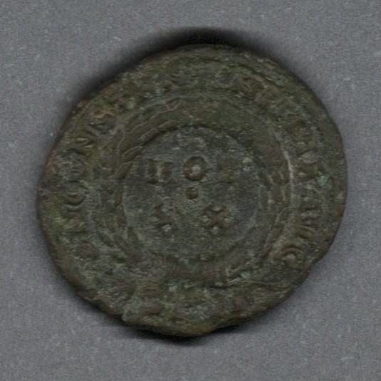 Moneda acuñada por el emperador Constantino I el Grande, mientras era coemperador con Licinio I, en conmemoración a sus 20 años de gobierno. Anverso con el busto laureado del emperador Constantino a la derecha, leyenda "CONSTA-NTINVS AVG" y borde de puntos. Reverso con una guirnalda de laurel con la inscripción "VOT / · / XX", leyenda "D N CONSTANTINI MAX AVG", en el exergo "TSΓVI" y borde de puntos. Fabricada por acuñación a martillo, peso 2,5 gr.