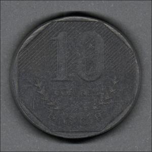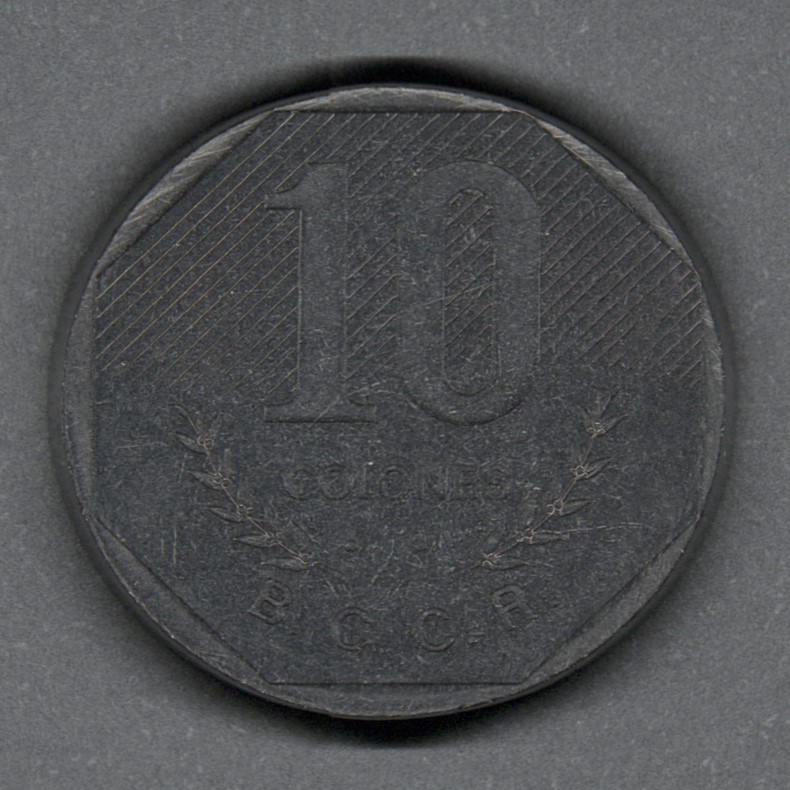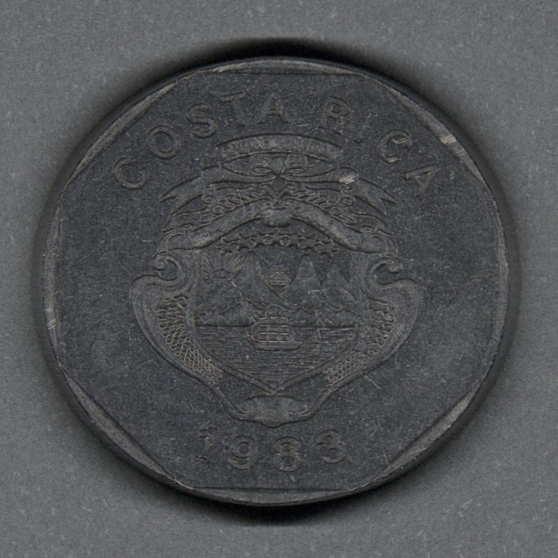 Moneda circulante normal de Costa Rica. En anverso presenta escudo de Costa Rica. Siete estrellas representan las siete provincias, tres volcanes extintos las tres cadenas montañosas, dos barcos simbolizan la situación geográfica del país entre los océanos Atlántico y Pacífico y el amanecer a la izquierda, todo rodeado por un borde octogonal. Al reverso denominación sobre ramas de café, cinta detrás del valor e iniciales del "Banco Central de Costa Rica" y valor en braille, todo rodeado por un borde octogonal. El diseño del canto es juncoso.