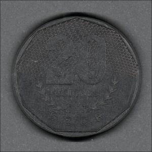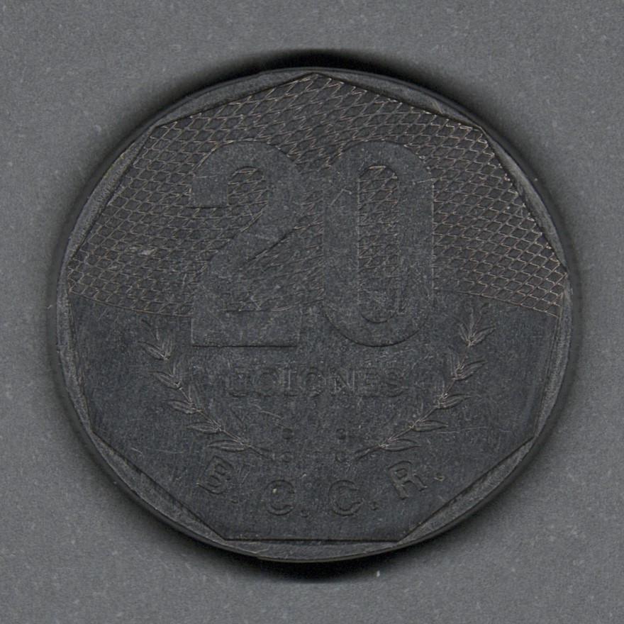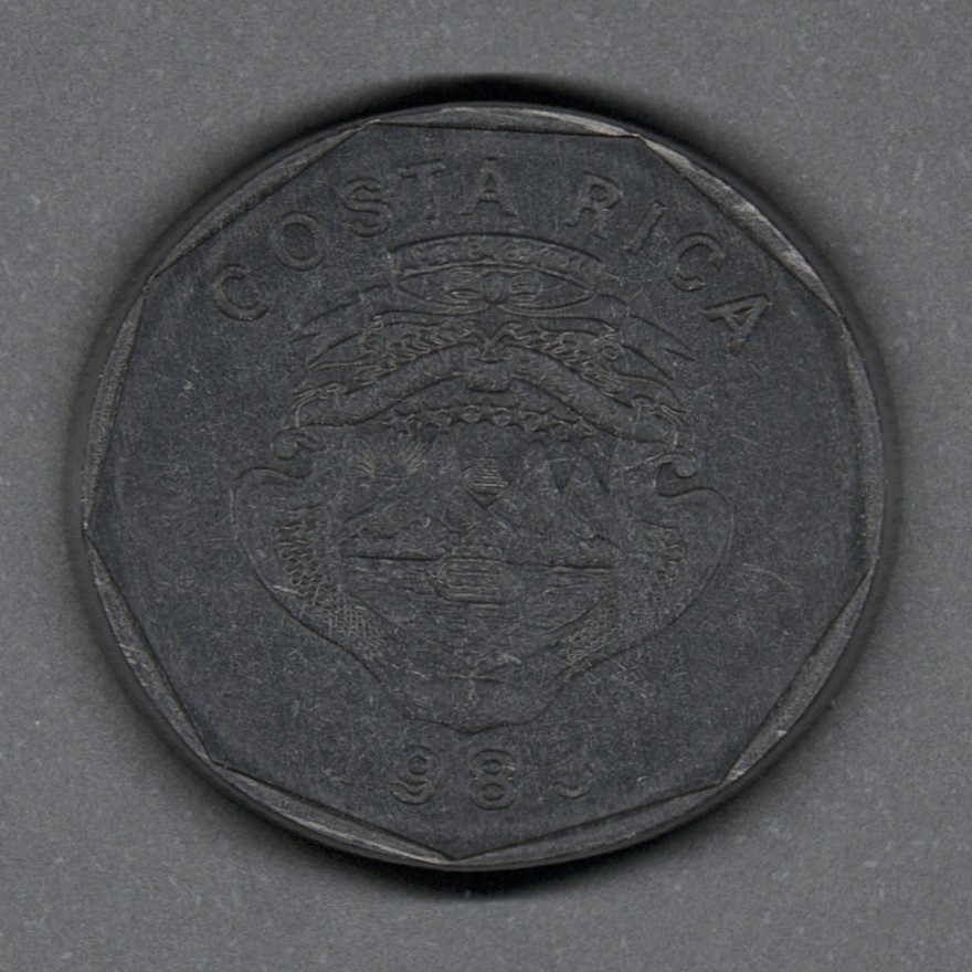 Moneda circulante normal de Costa Rica. En anverso presenta las armas de Costa Rica (siete estrellas que representan las siete provincias, tres volcanes extintos para las tres cadenas montañosas, dos barcos que simbolizan la situación geográfica del país entre el océano Atlántico y el Pacífico y la salida del sol a la izquierda), la fecha abajo, el nombre del país arriba, todo dentro de un borde octogonal. Al reverso denominación sobre ramas de café, cinta detrás del valor y las iniciales del "Banco Central de Costa Rica" junto con el valor en Braille, todo ello dentro de un reborde octogonal. El diseño del canto es juncoso.