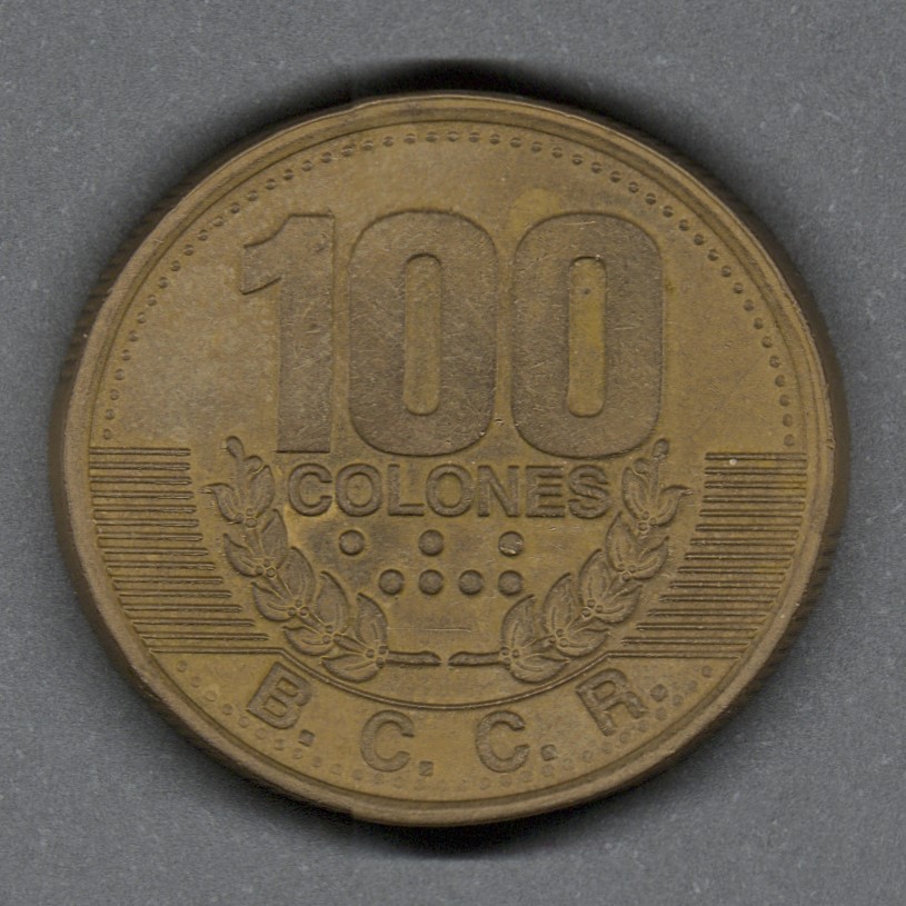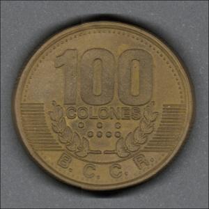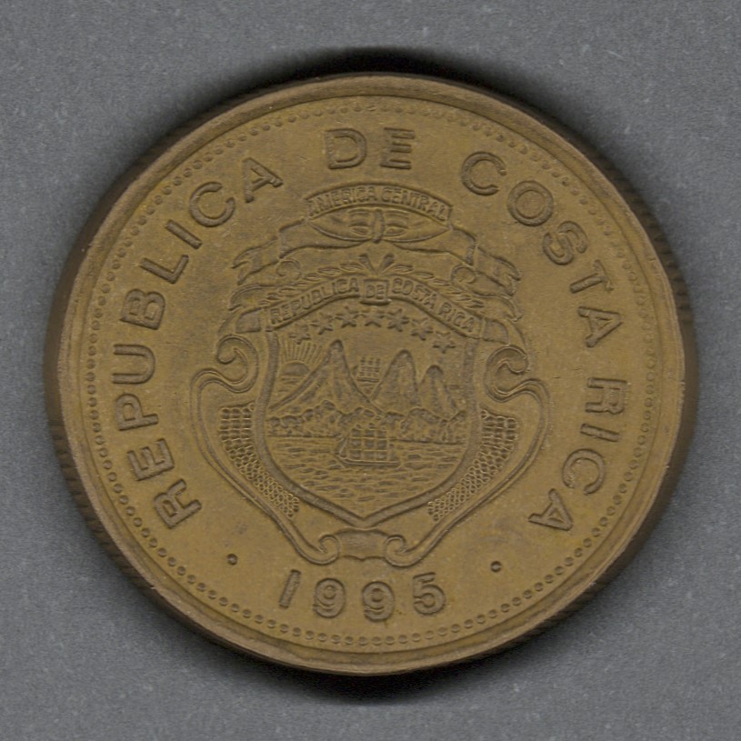 Moneda circulante normal de Costa Rica. En anverso presenta escudo de Costa Rica. Siete estrellas representan las siete provincias, tres volcanes extintos las tres cadenas montañosas, dos barcos simbolizan la situación geográfica del país entre los océanos Atlántico y Pacífico y el amanecer a la izquierda. Al reverso denominación por encima de las ramas de café e iniciales por debajo. Valor en Braille. El diseño del canto posee 4 segmentos lisos y 4 segmentos acanalados (14 ranuras cada uno).