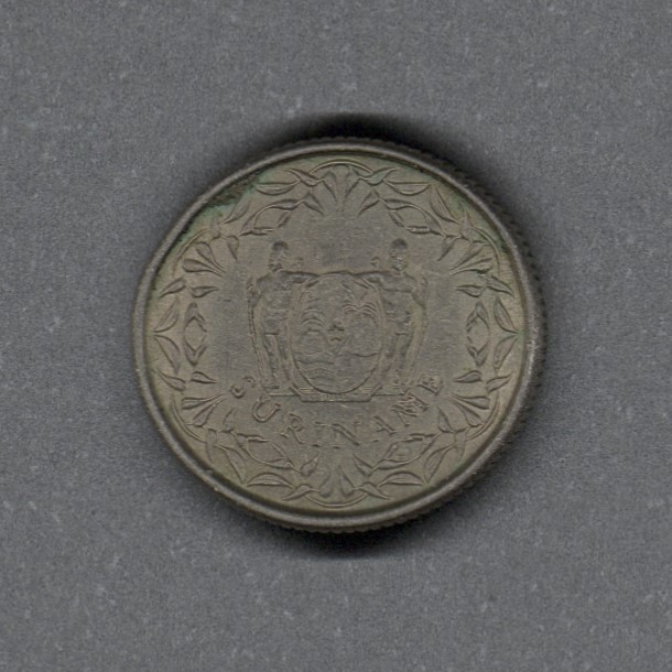 Monedas circulantes normales de Surinam. En anverso escudo de armas sostenido por dos nativos. Leyenda debajo. Todo rodeado por una corona. En reverso denominación flanqueada por la marca de la Fábrica de la Moneda y el año.