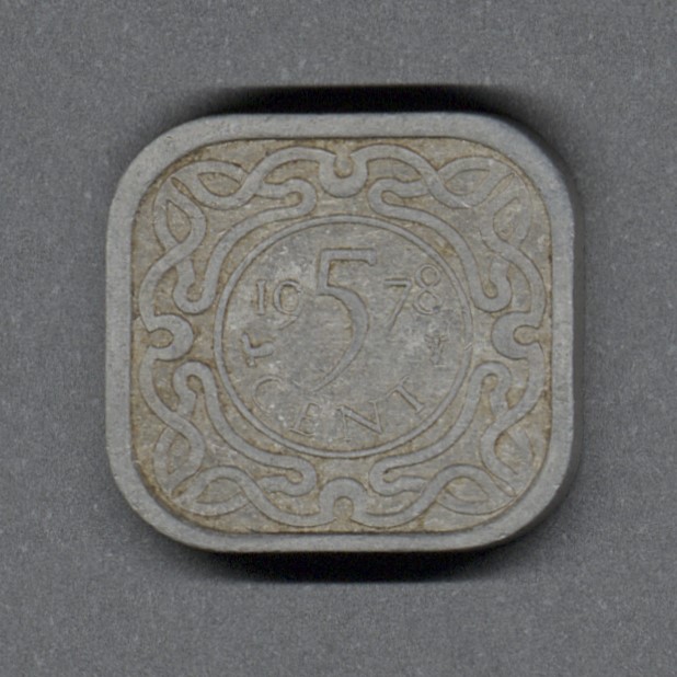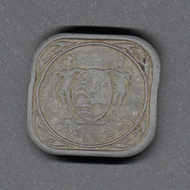 Monedas circulantes normales de Surinam. En anverso escudo de armas sostenido por dos nativos. Leyenda debajo. Todo rodeado por un círculo. En reverso denominación divide el año, la ceca y la marca privada. El conjunto está rodeado por un círculo y un dibujo.