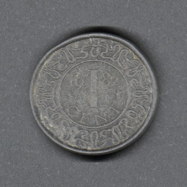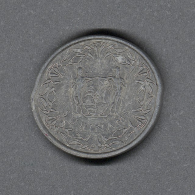 Monedas circulantes normales de Surinam. En anverso escudo de armas sostenido por dos nativos. Leyenda debajo. Todo rodeado por un círculo. En reverso diseño y círculo que rodean el año, el valor, la marca privada y la marca de ceca (caduceo, Utrecht). El diseño hace referencia a las tallas de madera de los cimarrones surinameses (esclavos fugitivos).