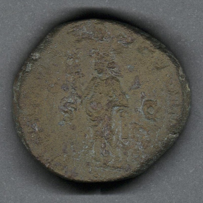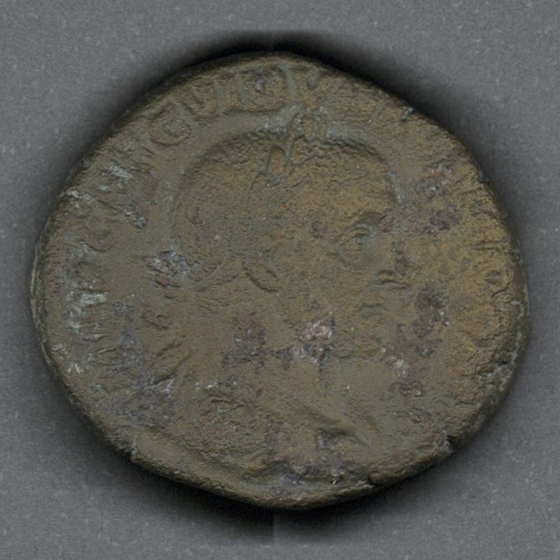 Moneda acuñada por el emperador Volusiano como coemperador con su padre, Treboniano Galo, y mediante aprobación del Senado. Anverso con el busto laureado del emperador Volusiano, drapeado sobre la coraza y mirando a la derecha, leyenda "IMP CAE C VIB VO(LUSIANO) AVG" y borde de puntos. Reverso con la diosa Felicitas drapeada de pie hacia la izquierda, sosteniendo un caduceo largo con la mano derecha y afirmando el brazo izquierdo sobre un medio pilar, leyenda parcialmente legible "(FELICI)TAS PVBLICA" y en el campo "S C". Fabricada por acuñación a martillo, peso de 14,7 gr.