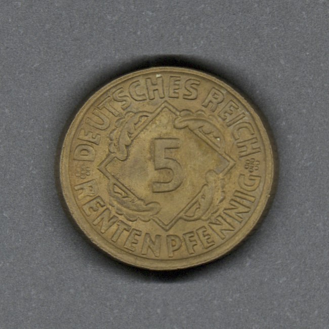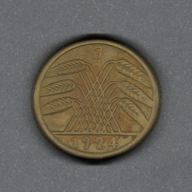 Moneda circulante normal de Alemania. En anverso presenta valor nominal en un cuadrado con 4 hojas de roble. Al reverso, espigas de trigo dibujando una pirámide. Ambas caras fueron grabadas por Waldemar Raemisch, y el diseño del canto es juncoso.
