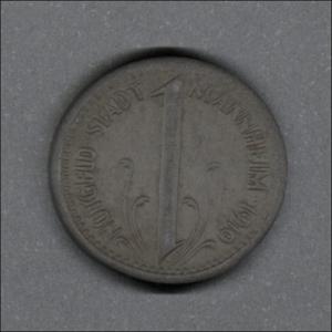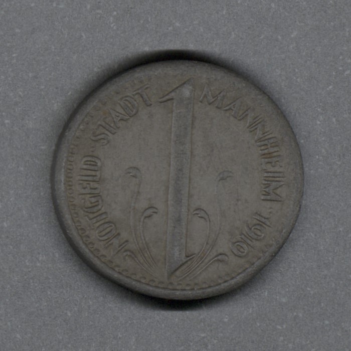 Moneda de emergencia usada en la ciudad de Mannheim (Estado federado de Baden, Alemania), en anverso presenta borde perlado con leyenda que flanquea la imagen de un gancho de lobo heráldico, indicando "NOTGELD STADT MANNHEIM". Al reverso posee borde de cuerda gruesa que rodea la denominación. El diseño del canto es llano.