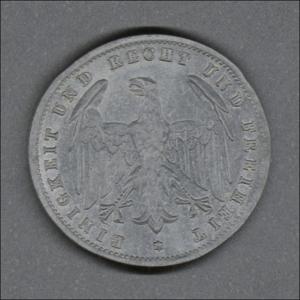 Moneda circulante normal de Alemania. En anverso presenta águila heráldica en el centro con letras alrededor del borde de cuentas. Al reverso, denominación central en tamaño grande con fecha y marca de ceca debajo. Letras alrededor del reborde. El grabador de ambas caras fue Josef Wackerle. El diseño del canto es juncoso.