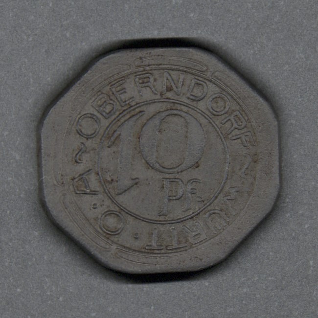 Moneda de emergencia usada en el distrito de Oberndorf am Neckar (Estado federado de Württemberg, Alemania), en anverso presenta leyenda que rodea el círculo de línea continua con la denominación, y al reverso tres escudos de armas con escudo central que divide la leyenda en la parte inferior. El diseño del canto es llano.
