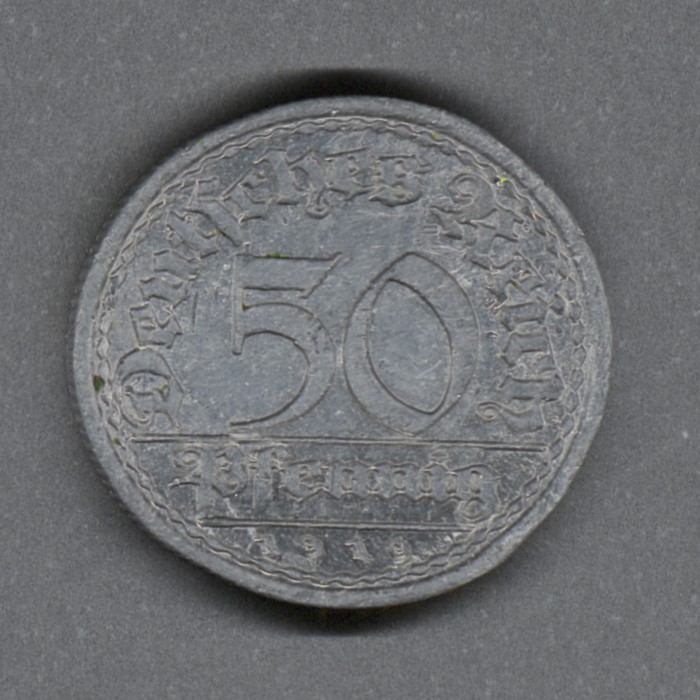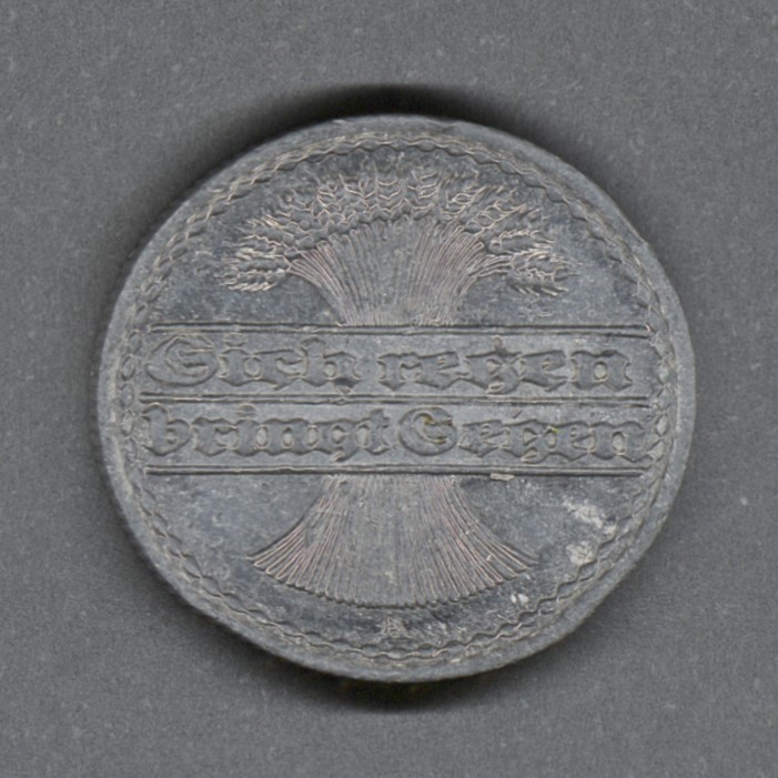 Moneda circulante normal de Alemania. En anverso presenta el proverbio "el trabajo duro da sus frutos" en una gavilla de trigo, y al reverso, valor y fecha en exergo. La grabación de ambas caras estuvo a cargo de Louis Oppenheim y Reinhard Kullrich. El diseño del canto es juncoso.