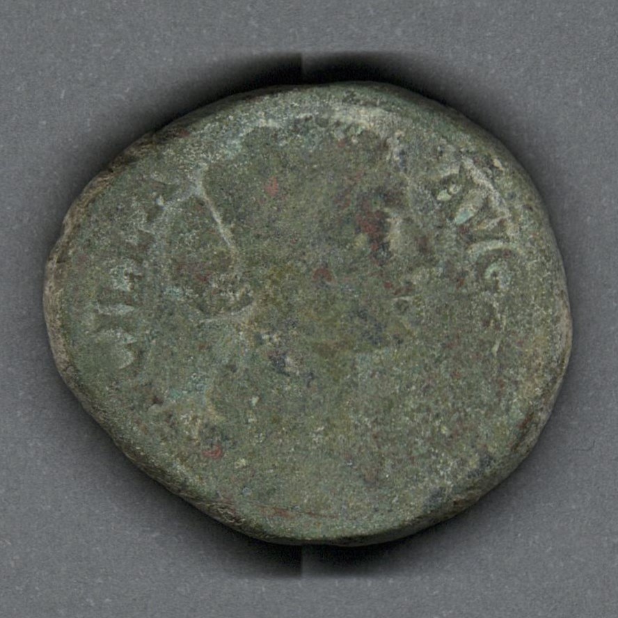 Moneda acuñada, mediante aprobación del Senado, por el emperador Marco Aurelio en honor a su hija, Lucila, esposa del coemperador Lucio Vero. Anverso con el busto de la emperatriz Lucila mirando a la derecha, con el pelo recogido en un moño bajo detrás de la cabeza y drapeada, leyenda parcialmente visible "LVCILLA AVGVSTA" y borde de puntos. Reverso con la diosa Pietas drapeada de pie a la izquierda, junto a un altar en el campo izquierdo; leyenda desgastada. Fabricada por acuñación a martillo, peso de 19,4 gr.