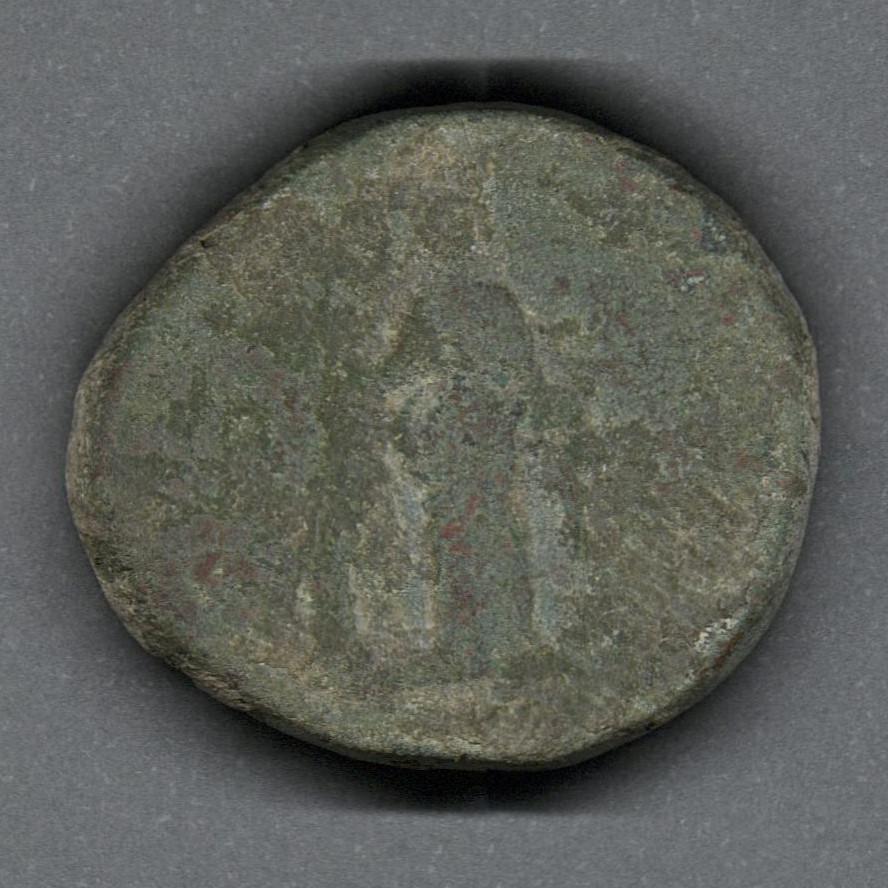 Moneda acuñada, mediante aprobación del Senado, por el emperador Marco Aurelio en honor a su hija, Lucila, esposa del coemperador Lucio Vero. Anverso con el busto de la emperatriz Lucila mirando a la derecha, con el pelo recogido en un moño bajo detrás de la cabeza y drapeada, leyenda parcialmente visible "LVCILLA AVGVSTA" y borde de puntos. Reverso con la diosa Pietas drapeada de pie a la izquierda, junto a un altar en el campo izquierdo; leyenda desgastada. Fabricada por acuñación a martillo, peso de 19,4 gr.