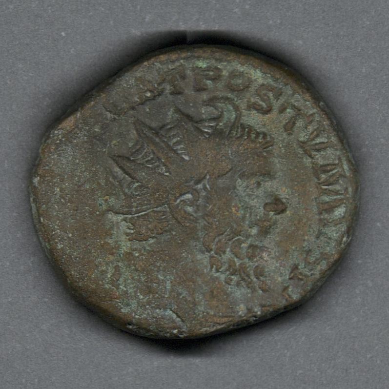 Moneda acuñada por el emperador Póstumo en el llamado "Imperio galo", una de las escisiones del Imperio romano durante la crisis del siglo tercero. Anverso con el busto radiado del emperdor Póstumo, drapeado sobre la coraza y mirando a la derecha, leyenda parcialmente desgastada "(IMP C M CASS) LAT POSTVMVS (P F) AVG" y borde de puntos. Reverso con una Victoria alada avanzando a la izquierda y un cautivo a sus pies, leyenda parcialmente legible "VICT(ORIA) AVG" y en el exergo "S C". Fabricada por acuñación a martillo, peso de 11,4 gr.