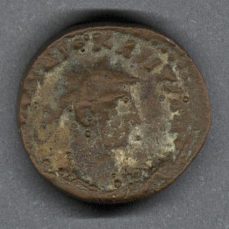 Pieza en estado de conservación regular y peso reducido para el tipo, por lo que se sugiere mayor investigación metalúrgica y se ofrece una identificación tentativa. Moneda probablemente acuñada por el emperador Diocleciano en la ceca de Alejandría, para circulación local. Anverso con el busto laureado del emperador Diocleciano llevando coraza y mirando a la derecha, leyenda parcialmente legible "(...)ΔΙΟΚΛΗΤΙ(...)" y borde de puntos. Reverso con la diosa Eusebeia (piedad) drapeada de pie a la izquierda, sosteniendo una caja de incienso con la mano izquierda y exteniendo la mano derecha hacia un altar en el campo izquierdo, arriba " L A" y borde de puntos. Fabricada por acuñación a martillo, peso de 2,9 gr.