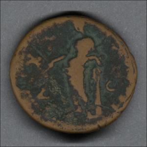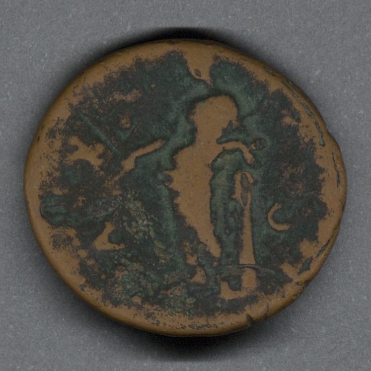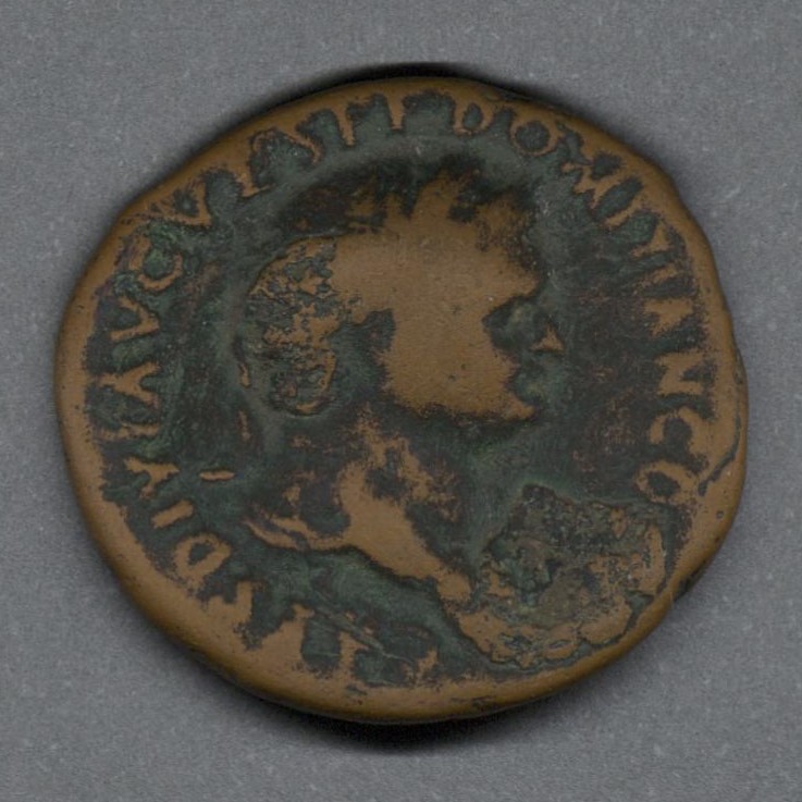 Moneda acuñada por Domiciano como César de su hermano, el emperador Tito, en honor a su padre divinizado. Anverso con el busto laureado de Domiciano mirando a la derecha y leyenda "CAES DIVI AVG VESP F DOMITIAN CO(S VII)". Reverso con la diosa Pax drapeada de pie a la izquierda, sosteniendo un caduceo en la mano derecha y una rama en la mano izquierda, mientras se afirma con el brazo izquierdo en una columna; leyenda parcialmente visible "PAX (AVGVST)", en el campo marca "(S) C" y borde de puntos. Fabricada por acuñación a martillo, peso de 8,7 gr.
