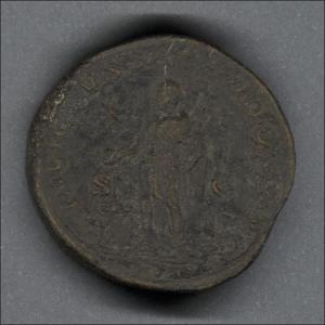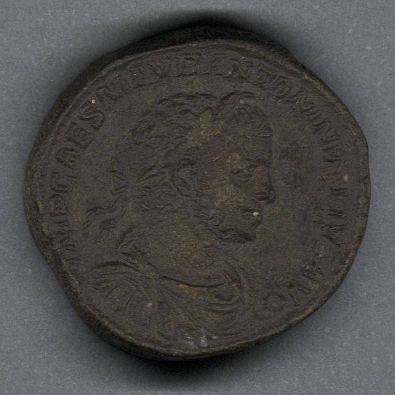 Moneda acuñada por el emperador Heliogábalo, mediante aprobación del Senado. Anverso con el busto laureado del emperador Heliogábalo con cuernos, mirando a la derecha y drapeado sobre la coraza, leyenda "IMP CAES M AVR ANTONINVS PIVS AVG" y borde de puntos. Reverso con el emperador de pie con vestimenda sacerdotal siria mirando a la izquierda, realizando un sacrificio con una pátera en la mano derecha sobre un altar y sosteniendo un garrote con el brazo izquierdo, leyenda "INVICTVS SACERDOS AVG", en el campo "S C" y borde de puntos. Fabricada por acuñación a martillo, peso de 22,7 gr.