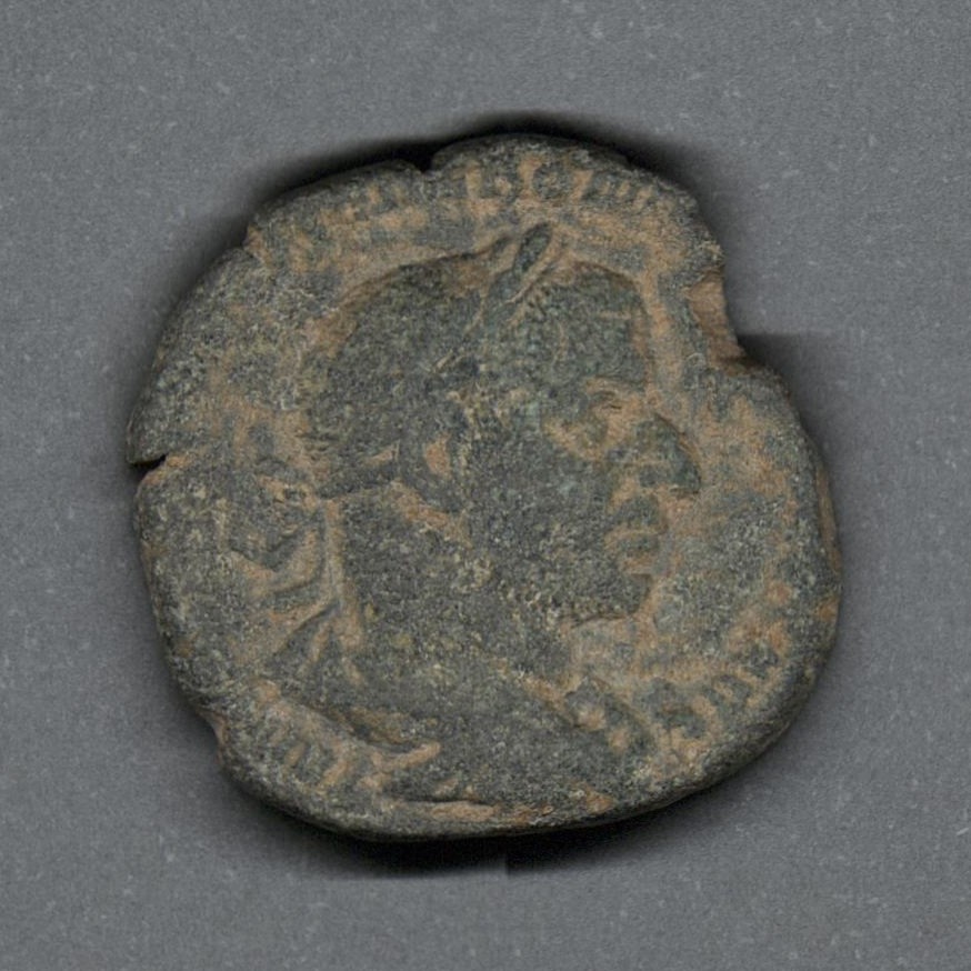 Pieza en estado de conservación regular, recortada (clipped) y desgastada, por lo que la identificación propuesta es tentativa. Moneda acuñada por el emperador Treboniano Galo, mediante aprobación del Senado. Anverso con el busto laureado del emperador Treboniano Galo, drapeado sobre la coraza y mirando a la derecha, leyenda mayormente desgastada "(...)BON(...)". Reverso con el dios Apolo de pie a la izquierda, sosteniendo una rama con la mano derecha y una lira con la mano izquierda, leyenda desgastada, "S C" en el campo y exergo sin marcas. Fabricada por acuñación a martillo, peso de 11,2 gr.