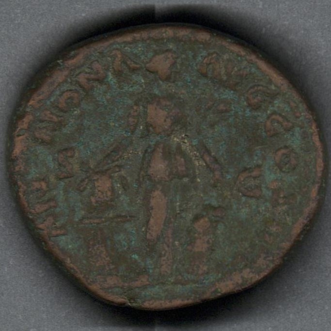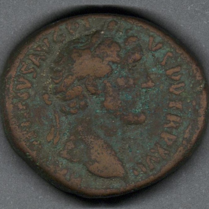 Moneda acuñada por el emperador Antonino Pío, mediante aprobación del Senado. Anverso con el busto laureado del emperador Antonino Pío, leyenda "ANTONINVS AVG PI-VS P P TR P XVII" y borde de puntos. Reverso con la diosa Annona drapeada de pie a la derecha, sosteniendo un modio con la mano izquierda sobre un cipo y sosteniendo una rama con la mano derecha, sobre una canasta de frutas, leyenda "AN-NONA - AVG COS IIII", en el campo "S C" y borde de puntos. Fabricada por acuñación a martillo, peso de 11,2 gr.
