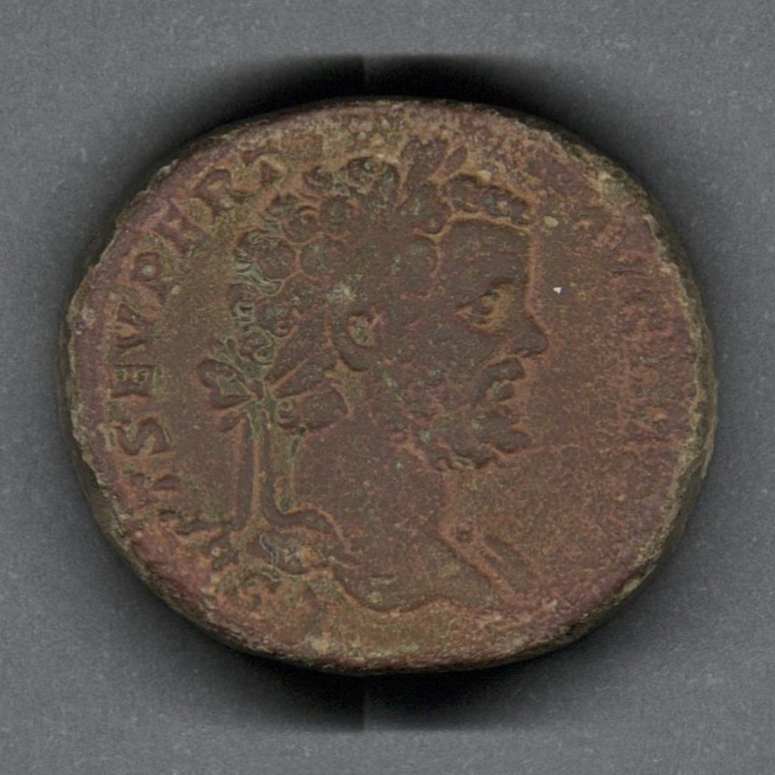 Moneda acuñada por el emperador Septimio Severo, mediante aprobación del Senado. Anverso con el busto laureado del emperador Septimio Severo mirando a la derecha, leyenda "L SEPT SEV PERT - AVG (IMP V)" y borde de puntos. Reverso con la diosa Roma llevando casco, entronada a la izquierda, extendiendo la mano derecha y sosteniendo una Victoria, mientras sostiene una lanza con la mano izquierda, leyenda desgastada y en el campo "S C". Fabricada por acuñación a martillo, peso de 22 gr.