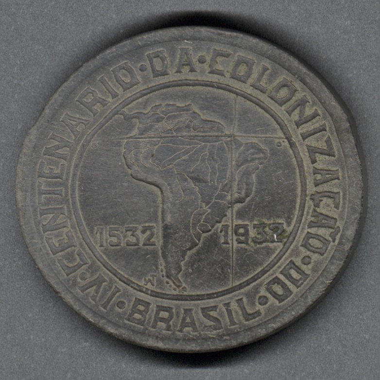 Monedas circulantes conmemorativas de Brasil, 400 aniversario de la colonización. En anverso mapa divide las fechas dentro de un círculo. En reverso cruz lusitana.