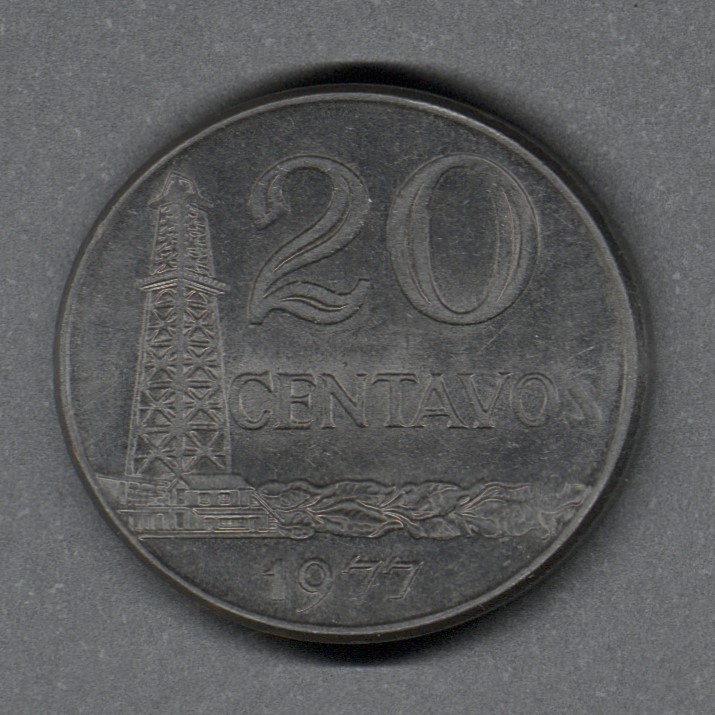 Monedas circulantes normales de Brasil. En anverso efigie representando a la República, rosa de los vientos abajo y estrella arriba. En reverso torre de aceite y hojas de humo.