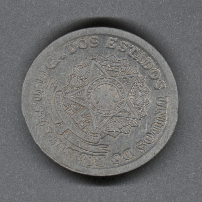 | Moneda de aluminio. Casa da Moeda do Brasil, Rio de Janeiro, Brasil (1694-presente). |