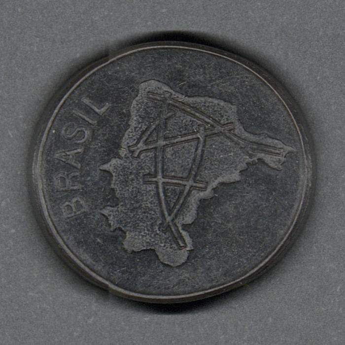 Monedas circulantes normales de Brasil. En anverso mapa de las principales carreteras de Brasil. En reverso valor flanqueado por granos de café, cinta detrás del valor.