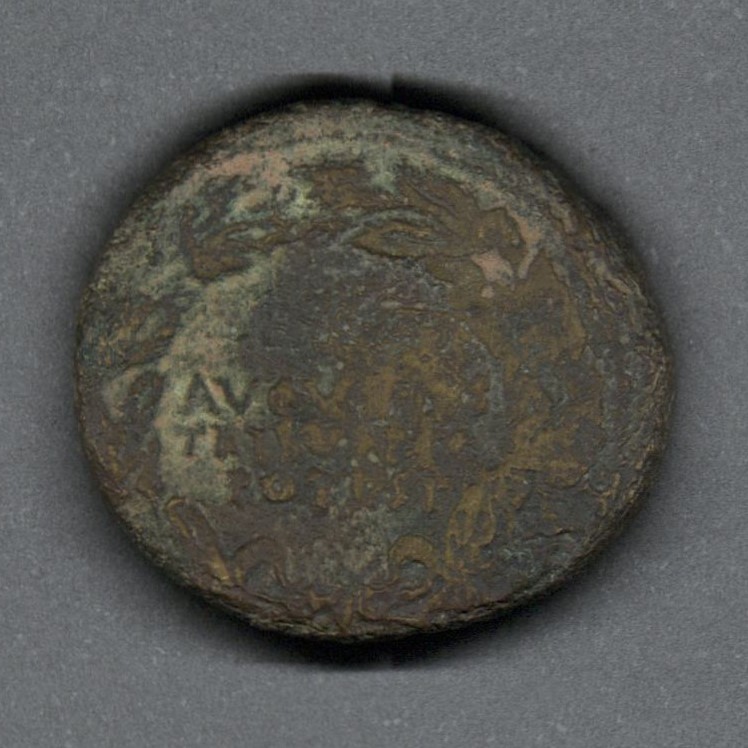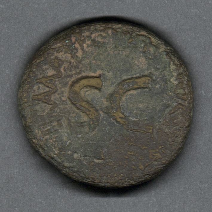 Moneda acuñada por un magistrado monetal (uno de los tresviri aere argento auro flando feriundo) para el emperador Augusto. El estado regular de la pieza impide reconocer exactamente el magistrado y tipo de la moneda, por lo que se ofrece una descripción con la información fehaciente. Anverso con una corona cívica, formada por tres líneas de hojas de roble, alrededor de la leyenda "AVGVSTVS / TRIBVNIC / POTEST" y borde de puntos. Reverso con la inscripción "S C" en el centro, rodeada de una leyenda desgastada "(...V)IR AAA (...)" y borde de puntos. Fabricada por acuñación a martillo, peso de 8,0 gr.
