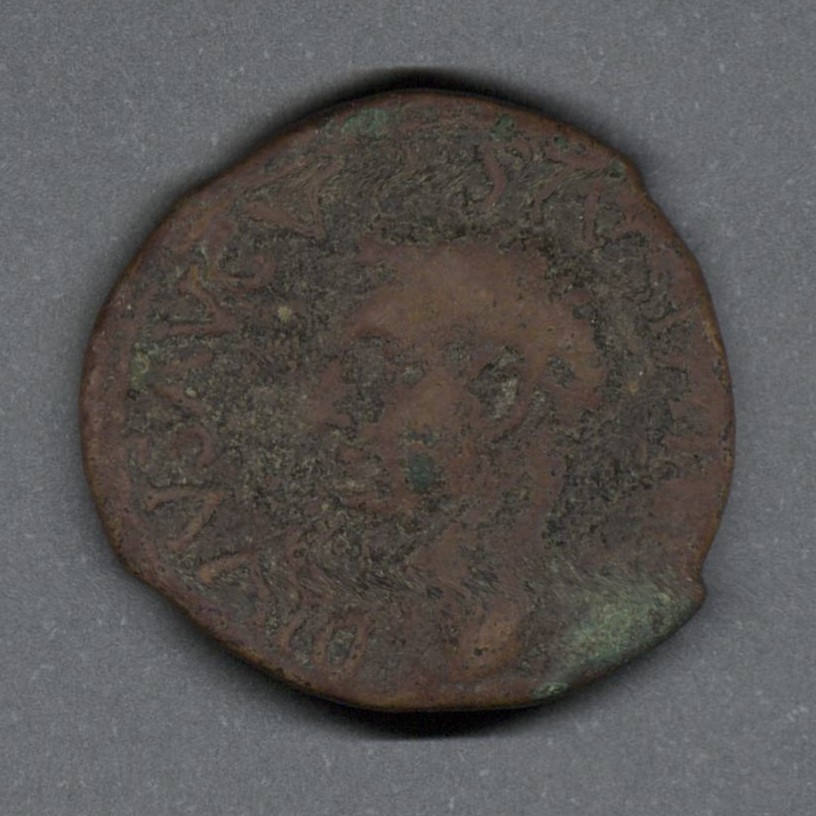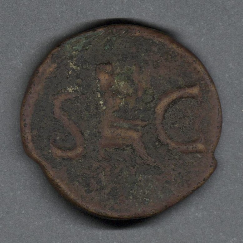Moneda acuñada por el emperador Tiberio, en honor al emperador Augusto divinizado, mediante aprobación del Senado. Anverso con el busto radiado del emperador Augusto mirando a la derecha, arriba una estrella y delante, un rayo; leyenda "DIVVS AVGVSTVS PATER" y borde de puntos. Reverso con una mujer drapeada y velada sentada a la derecha, sosteniendo una pátera y un cetro, leyenda "S C" y borde de puntos. Fabricada por acuñación a martillo, peso de 9,5 gr.