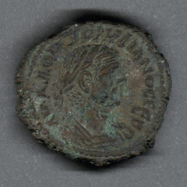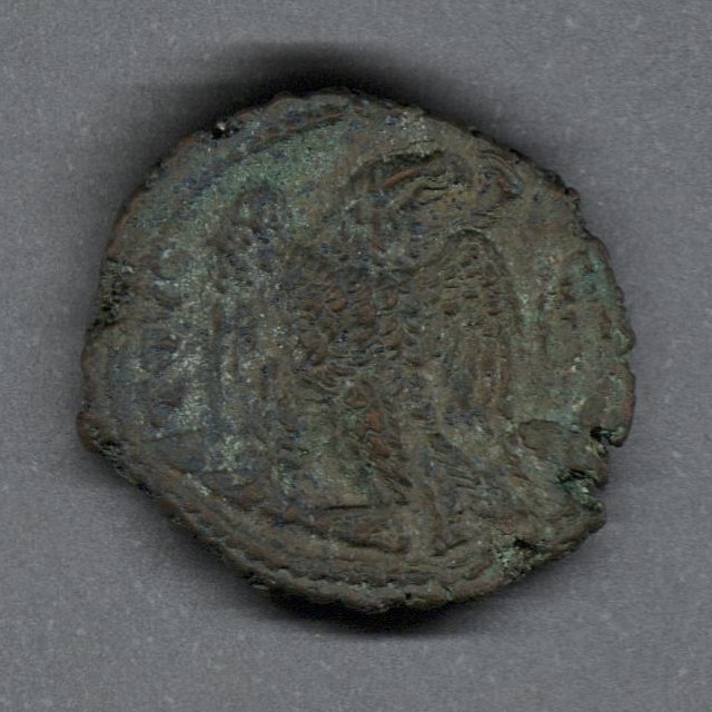 Moneda provincial acuñada por el emperador Aureliano. Anverso con el busto laureado del emperador Aureliano llevando coraza y mirando a la derecha, leyenda "Α Κ Λ ΔΟΜ ΑΥΡΗΛΙΑΝΟϹ ϹΕΒ" y borde de puntos. Reverso con un águila de pie con el cuerpo a la izquierda y la cabeza a la derecha, con las alas abiertas y una guirnalda en la boca, leyenda "ΕΤΟΥϹ Ε" y borde de puntos. Canto irregular. Fabricada por acuñación a martillo, peso de 6,0 gr.