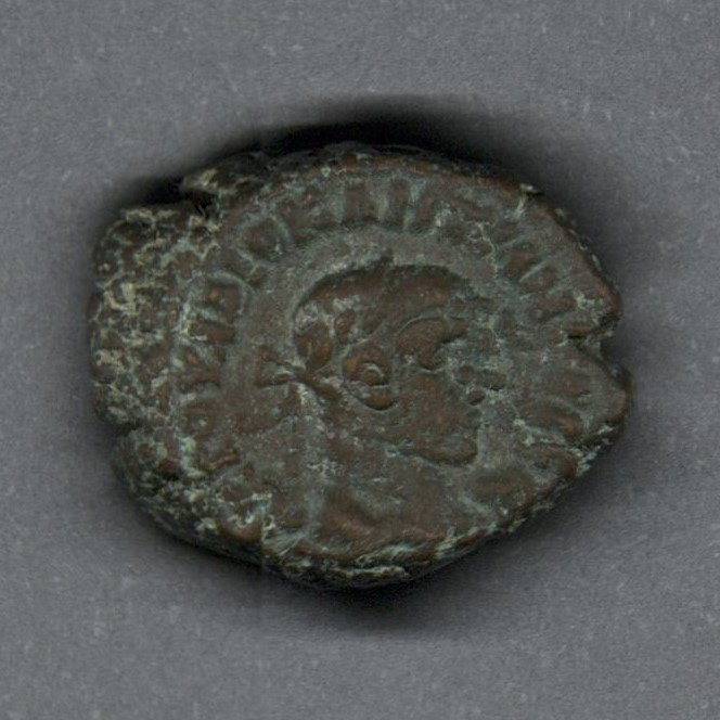 Moneda acuñada por el emperador Diocleciano como coemperador con Maximiano Hercúleo, para la provincia de Egipto. Anverso con el busto laureado del emperador Diocleciano llevando coraza y mirando a la derecha, leyenda "Α Κ Γ ΟΥΑ ΔΙΟΚΛΗΤΙΑΝΟϹ ϹΕΒ" y borde de puntos. Reverso con la diosa Eirene (paz) drapeada de pie a la izquierda, sosteniendo una rama de olivo con la mano derecha y con la izquierda, un cetro; leyenda "L Ε" y borde de puntos. Canto irregular. Fabricada por acuñación a martillo, peso de 8,1 gr.