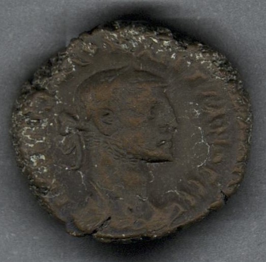 Moneda acuñada por el emperador Diocleciano como coemperador con Maximiano Hercúleo, para la provincia de Egipto. Anverso con el busto laureado del emperador Diocleciano llevando coraza y mirando a la derecha, leyenda "Α Κ Γ ΟΥΑ(Λ) ΔΙΟΚΛΗΤΙΑΝΟϹ ϹΕΒ" y borde de puntos. Reverso con Zeus de pie a la izquierda, sosteniendo una pátera con la mano derecha sobre un águila a sus pies y con la mano izquierda sosteniendo un cetro, leyenda "L B" y borde de puntos. Canto irregular. Fabricada por acuñación a martillo, peso de 7,3 gr.