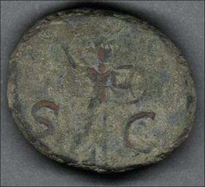 Moneda acuñada por el emperador Claudio, mediante aprobación del Senado. Anverso con el busto sin adornos del emperador Claudio mirando a la izquierda, leyenda parcialmente visible "(TI CLAVDIVS) CAESAR AVG (P M TR P IMP PP)" y borde de puntos. Reverso con la diosa Minerva drapeada, avanzando a la derecha, mientras apunta una jabalina con la mano derecha y sostiene un escudo redondo con la mano izquierda, a cada lado "S C" y borde de puntos. Fabricada por acuñación a martillo, peso de 13,5 gr.