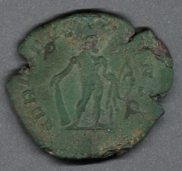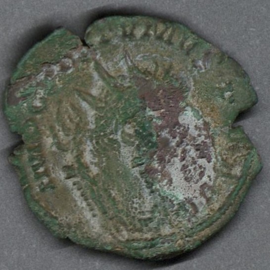 Moneda acuñada por el emperador Póstumo en el llamado "Imperio galo", una de las escisiones del Imperio romano durante la crisis del siglo tercero. Anverso con el busto radiado del emperador Póstumo, drapeado sobre la coraza y mirando a la derecha, leyenda con desgaste "IMP C (POS)TVMVS P (F) AVG" y borde de puntos. Reverso con Hércules de pie, afirmado sobre un garrote con la mano derecha y sosteniendo un arco y piel de león con la mano izquierda, leyenda "HERC (D)EV(SO)N(IE)NSI" y borde de puntos. Cospel con gruetas radiales, posiblemente como defecto de acuñación. Fabricada por acuñación a martillo, peso 3,1 gr.