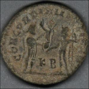Moneda acuñada por el emperador Diocleciano durante la Tetrarquía como coemperador con el Augusto Maximiano Hercúleo y los Césares Constancio Cloro y Galerio. Anverso con el busto radiado del emperador Diocleciano llevando coraza y mirando a la derecha, leyenda "IMP C C VAL DIOCLETIANVS P F AVG" y borde de puntos. Reverso con el emperador Diocleciano de pie drapeado sobre la coraza, recibiendo un globo con la diosa Victoria de Júpiter, también de pie, sosteniendo un cetro; leyenda parcialmente visible "CONCORDIA M(ILITVM)" y "K B" entre las figuras. Fabricada por acuñación a martillo, peso de 2,7 gr.