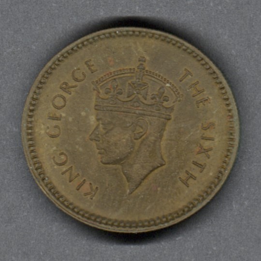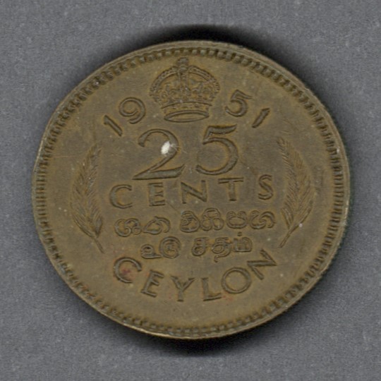 Monedas circulantes normales de Sri Lanka. En anverso retrato del rey George VI mirando a la izquierda. En reverso denominación y año de la moneda.