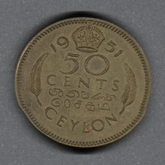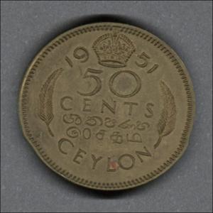 Monedas circulantes normales de Sri Lanka. En anverso retrato del rey George VI mirando a la izquierda. En reverso denominación y año de la moneda.