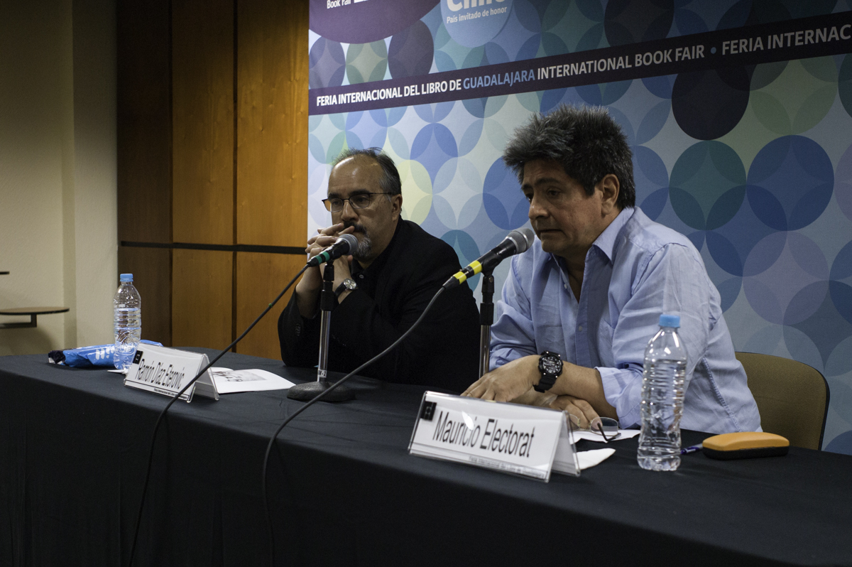 Díaz Eterovic con Mauricio Electorat en la Feria del Libro de Guadalajara, México..