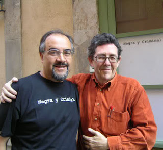 Díaz Eterovic con el librero y escritor Paco Camarasa, en la Librería Negra y Criminal. Barcelona..