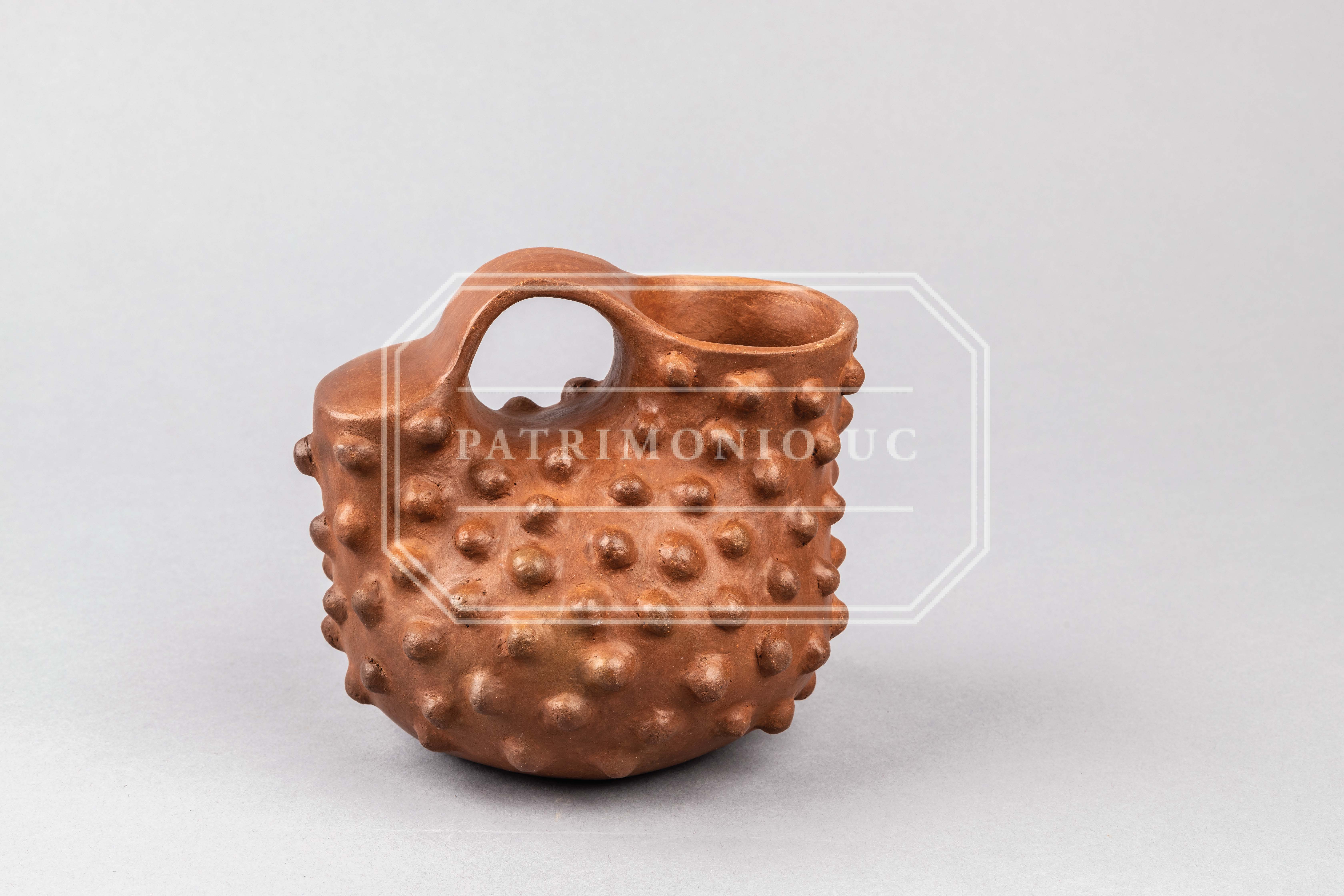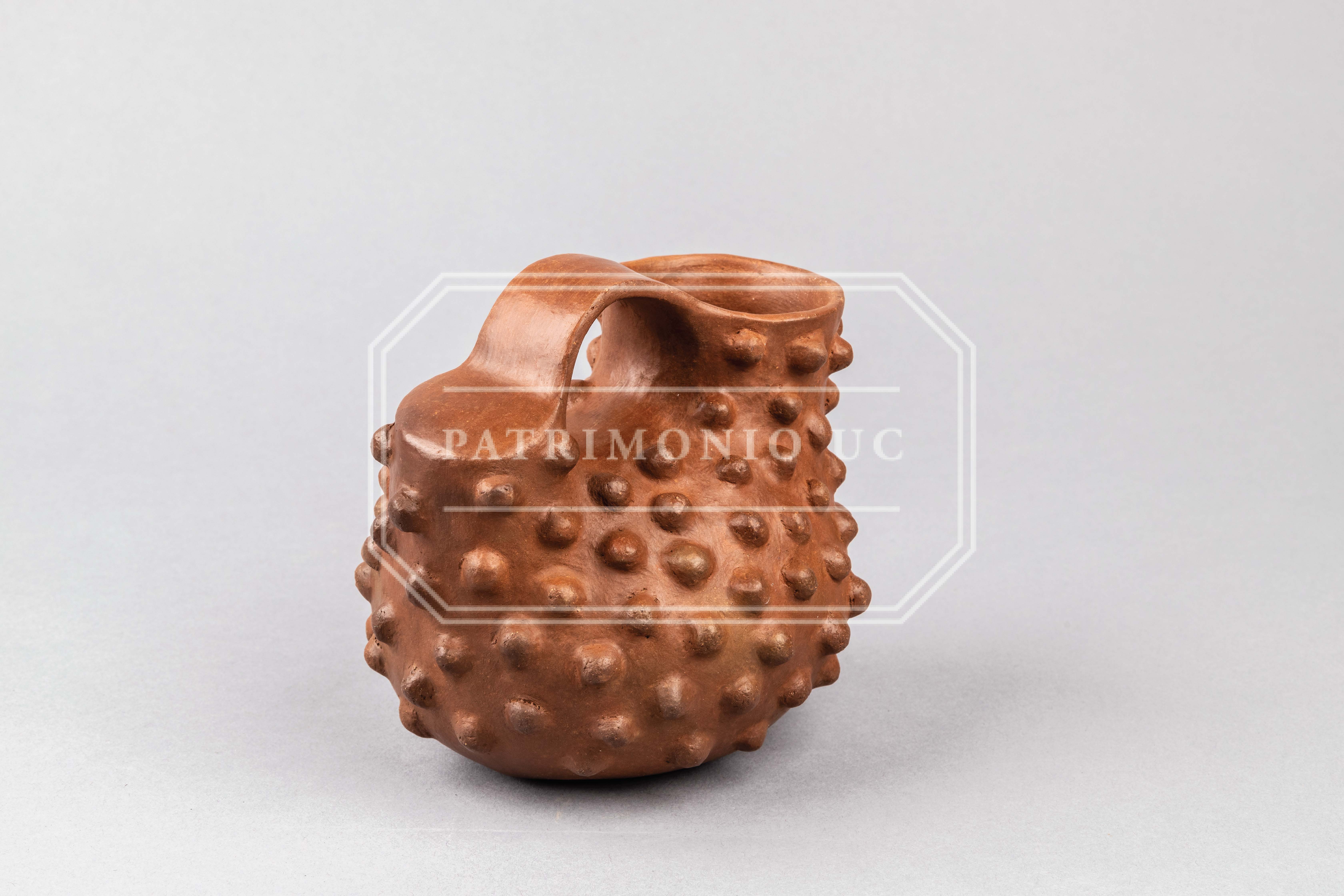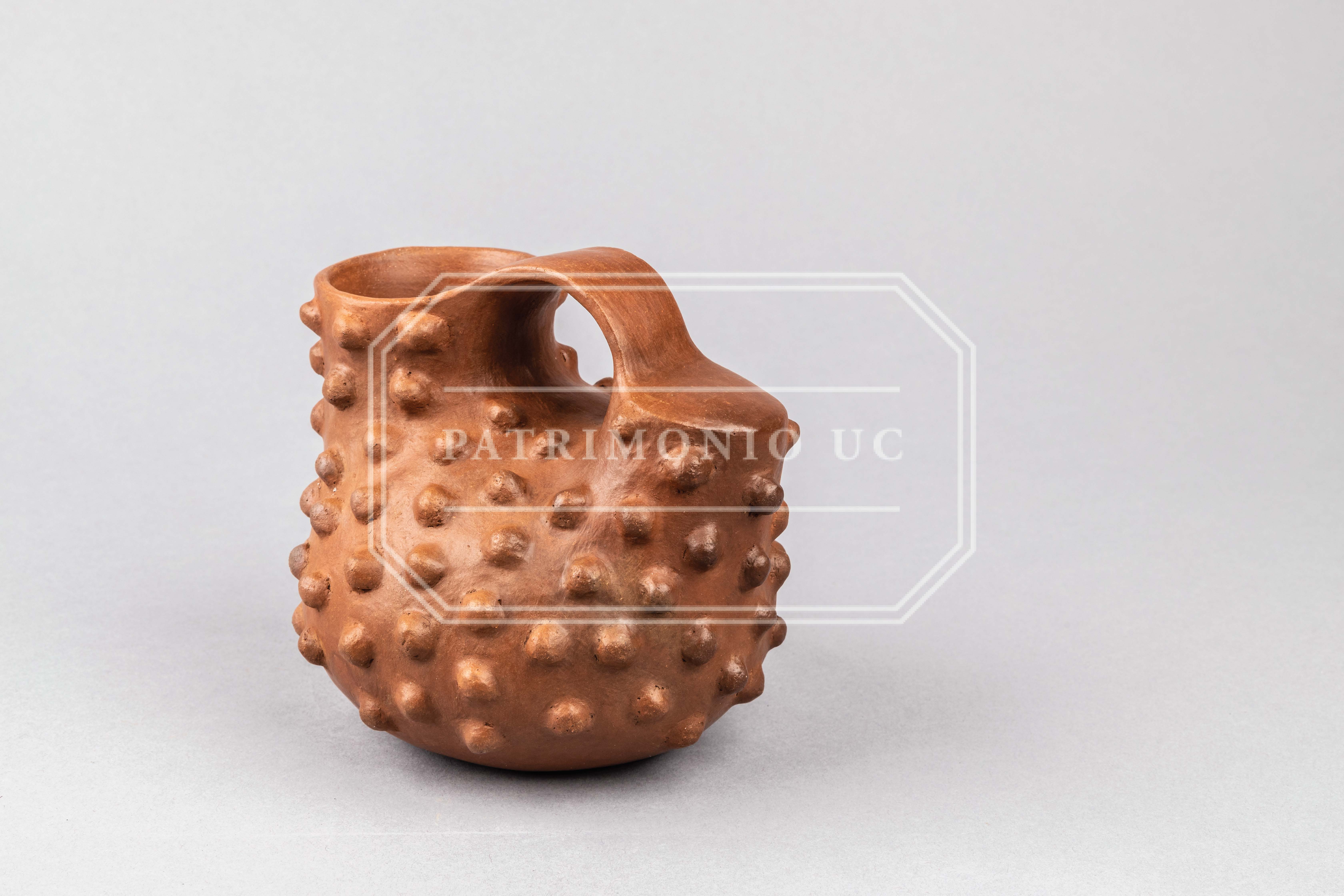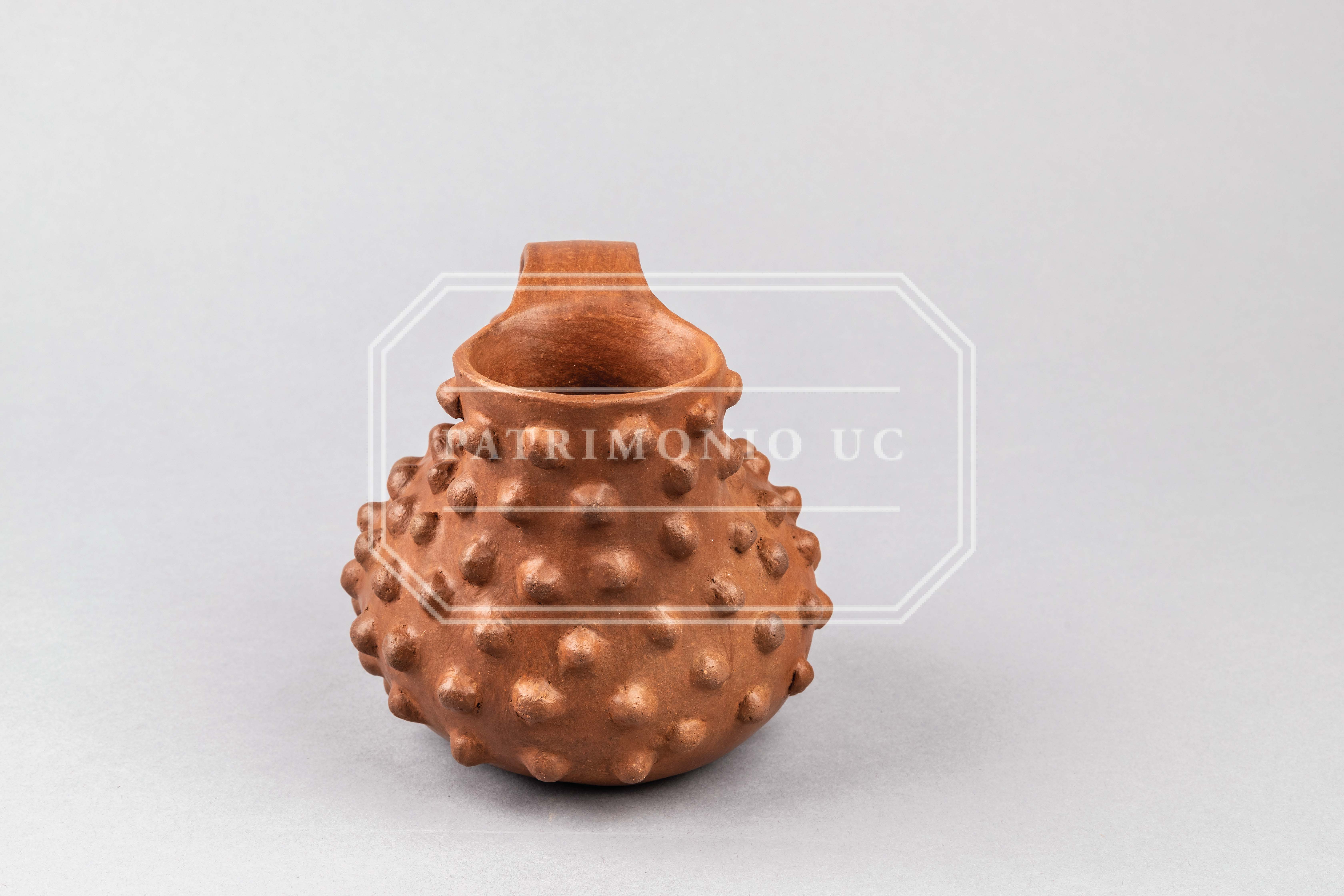 | dc.description.abstract | Zoomorphic Jar Evoking the Bullock’s Toad (Telmatobufo bullocki) This jar takes the form of a globular body with two slightly cylindrical necks connected by a bridge handle from lip to lip. One of the necks is open, while the other is sealed with a subtly concave circular piece. Made of reddish-brown ceramic, its surface features modeled protuberances arranged across the entire body of the jar. | |